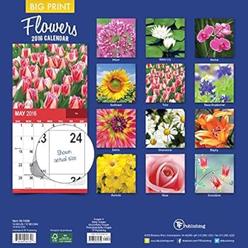 This bright and colorful calendar brings you as close to these beautiful flowers as you can get without touching them. Flowers identified. This is a big print calendar. All calendar pages are printed on FSC certified paper with environmentally safe inks.